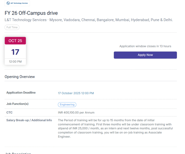 Company Name L&T Job Role Associate Engineer Trainee Qualification Bachelor’s Degree(Mechanical, Electrical, Civil, Instrumentation & Control, Chemical Engineering) Experience Freshers...