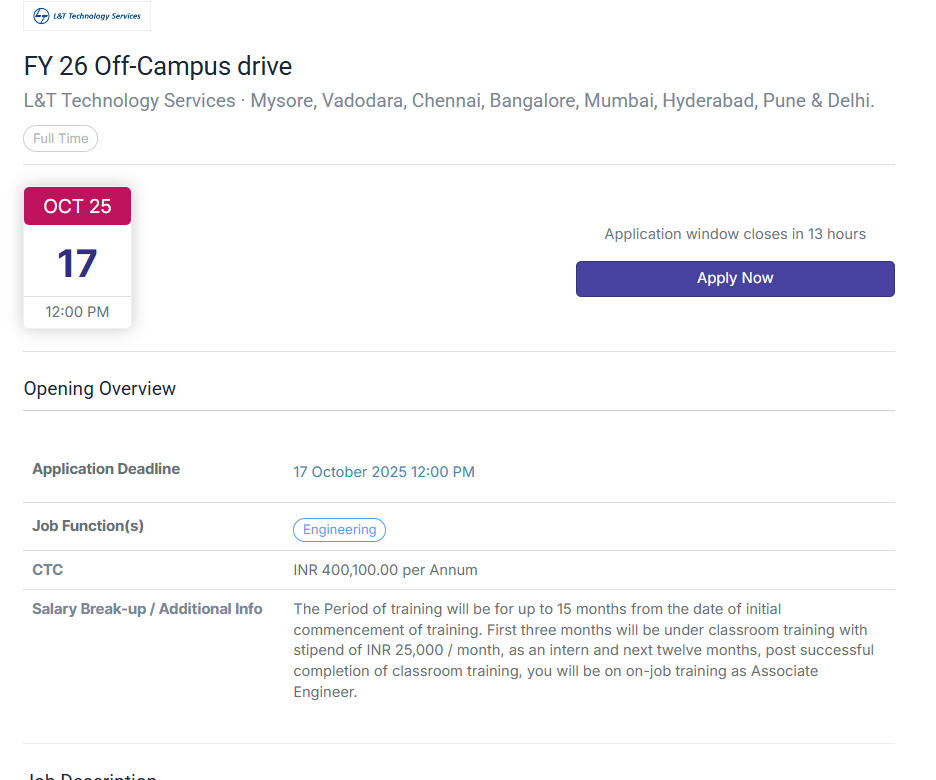 L&T Technology Services (LTTS) is inviting applications for its FY26 Off-Campus Drive for Associate Engineer Trainees across multiple engineering branches. This is a great opportunity for passionate and driven graduates to begin their engineering careers with one of India’s top technology service companies.